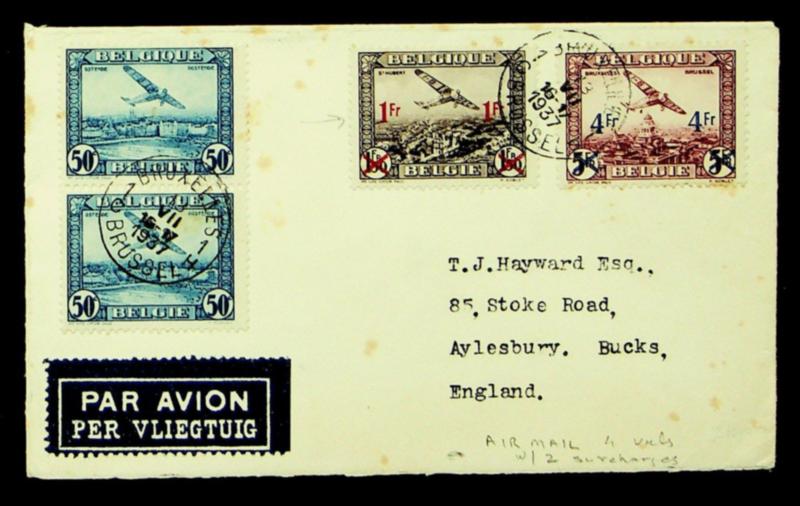 Belgium 1937 50c pair+ 2v w/ s/c on airmail cover from Brussels to England (Image)