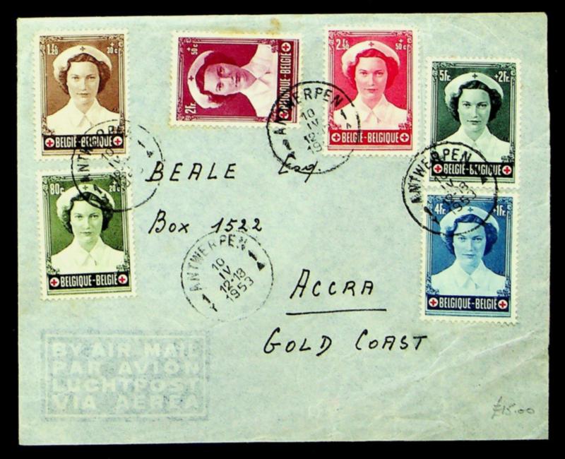Belgium 1953 Nurse Red Cross 6v on airmail cover from Antwerpen to Accra Gold Coast (Image)