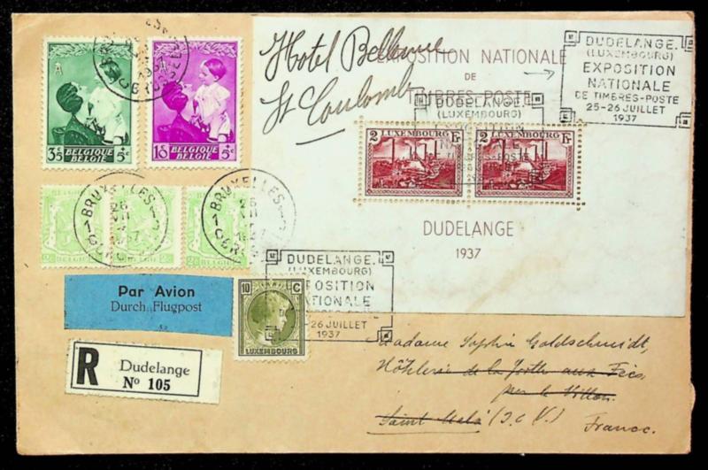 Belgium/ Luxembourg 1937 Dudelange National Expo 2v MS+ 6v mixed franked Regd airmail cover redirected to Hotel Bellevue St. Coulomb France (Image)
