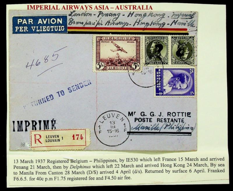 Belgium 1937 4v on Imperial Airways airmail Regd cover from Leuven via France/ Penang Malaya/ Hong Kong/ Canton China to Manila Philippines & Returned to Sender (Image)