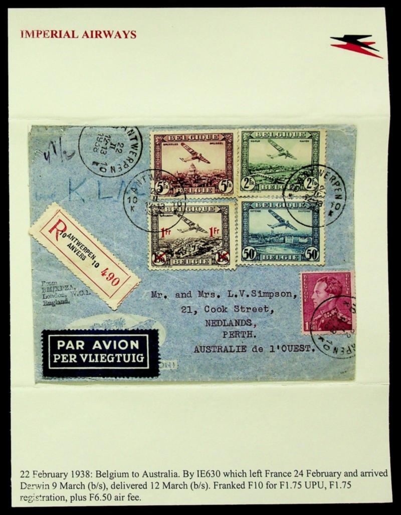 Belgium 1938 5v on Imperial Airways airmail Regd cover from Antwerpen via France to Nedlands W. Australia (Image)