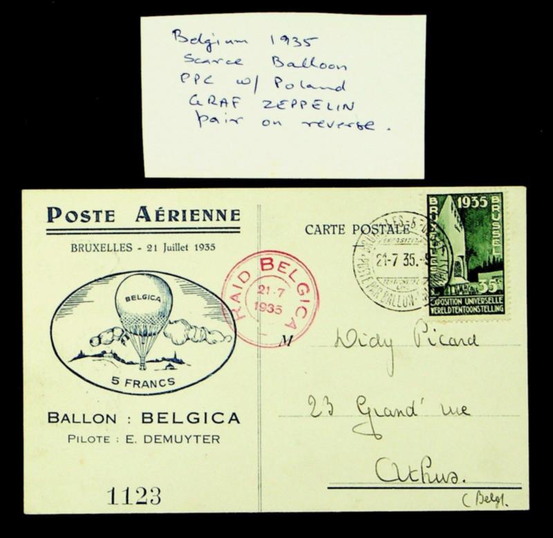 Belgium 1935 35c on Balloon postcard w/ "RAID BELGICA" red cachet & Poland Graf Zeppelin 5gr pair at back (Image)