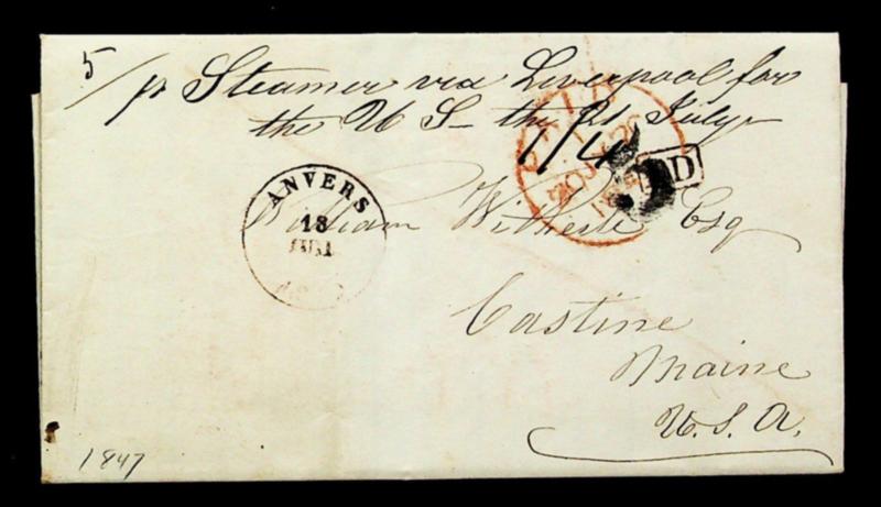 Belgium Anvers 1847 prestamp cover per Steamer via Liverpool w/ "PAID" & boxed "PD" cachets to USA w/ "CORISAH & ALLMARS COURTIERS DE NAWARES" Forwarding Agent's seal at back (Image)