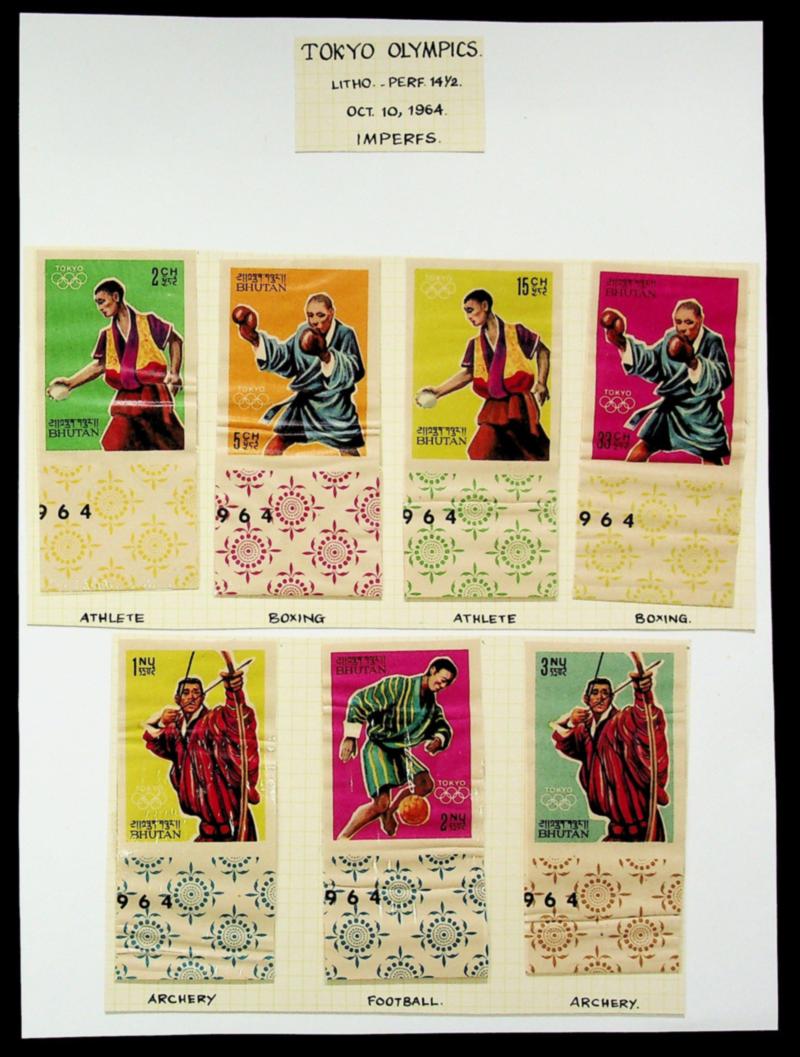 Bhutan 1964 Japan Tokyo Olympics Lithographs, 7v Imperf marginal Mint stamps w/ plate "964" (Image)
