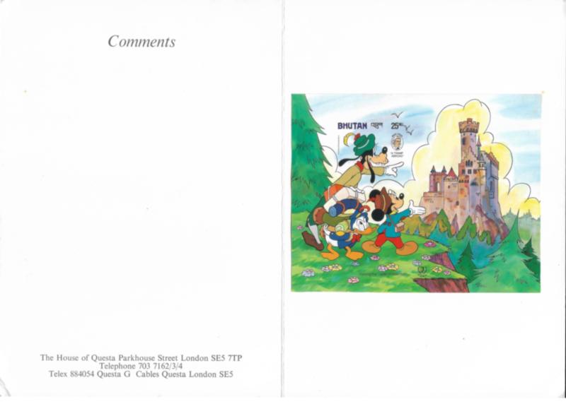 Bhutan 1995 25Nu very rare Unique Mark Twain Mickey Mouse, Donald Duck & Goofy, House of Questa Proof on card (Image)