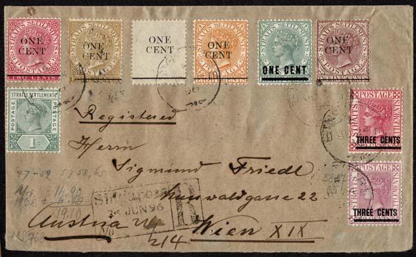 Symbol:Malaysia: Straits Settlements: 1885 3c on 32c pale magenta, 1892 set, 1892-94 1c on 8c and 3c on 32c, 1892-99 1c green, 9 values on 1896 (24 June) philatelic Registered cover to Sigmund Friedl, Vienna, stamps canceled by SINGAPORE JU 24 96 circular datestamps, cover bears boxed SINGAPORE 24 JU 96 R datestamp, backstamped with Vienna receiver of 20 July 1896, trivial stamp and cover faults, Scarce eight color combination. SG 83,88-92, 93-94,95.