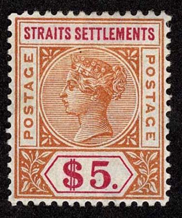 1892-99, Queen Victoria, $5.00 orange and carmine, watermarked Crown CA, o.g., small hinge remnants, fresh centered and very fine. SG 105; £450 ($610). (Scott 88). Scott $500 (Image)