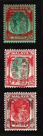 Japanese Occupation of Malaya: Straits Settlements, 1942 40c, $2, $5 Red Overprints, n.h. 40c and $2.00 with light natural gum toning, Fine to Very Fine, all signed Rowell. SG J156, 159,160; £625 ($850). (Scott N15,N18,N19). Scott $620 (Image)