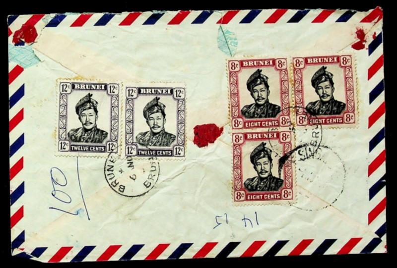 Brunei 1969 Sultan 12cx2+ 8cx3 franked at back of Regd airmail cover to Singapore (Image)