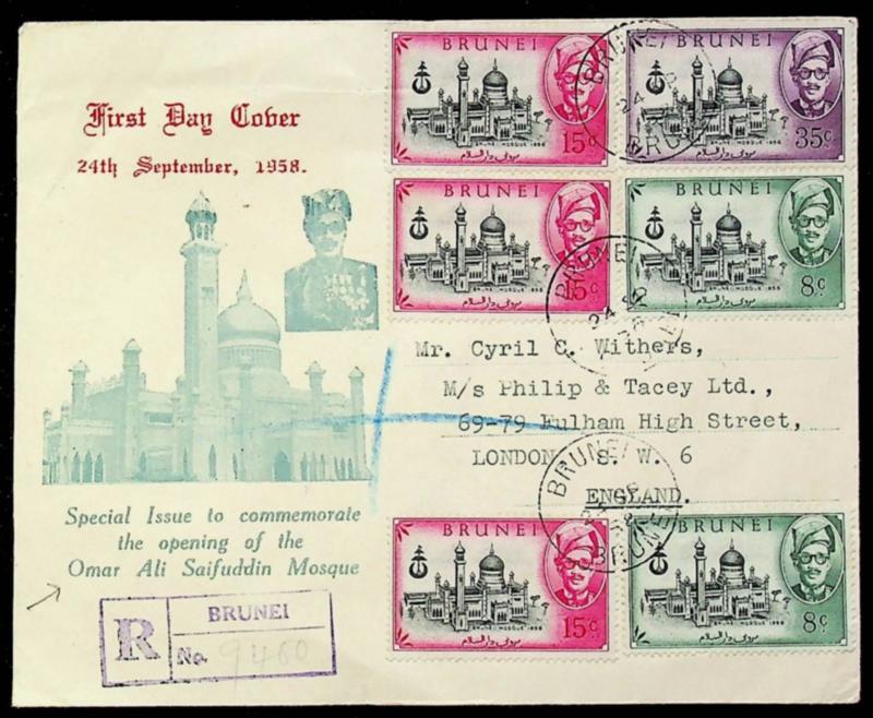 Brunei 1958 Opening of Omar Ali Saifuddin Mosque 6v Regd FDC via Singapore to London England (Image)