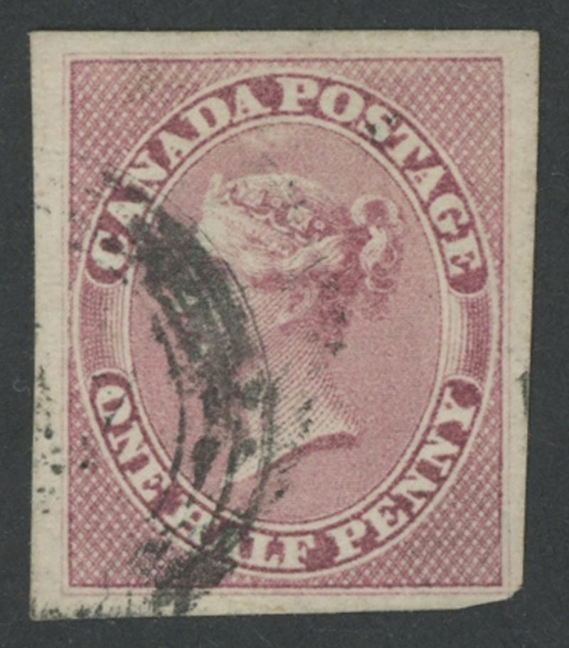 PROVINCE OF CANADA: 1857 Wove Paper Imperforate QV ½d rose SG 17 (Scott 8), margins good to large, small-part numeral cancel, Cat £650 (US$700). (Image1)