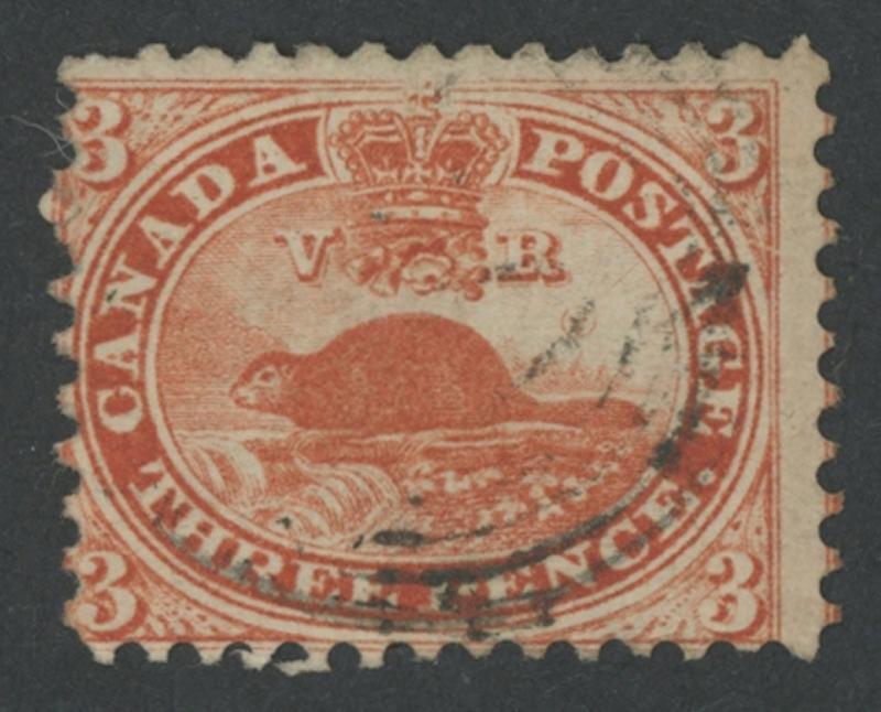 PROVINCE OF CANADA: 1858 Wove Paper Perf 12 Beaver 3d red SG 26 (Scott 12), characteristic poor centring, light concentric rings cancel clear of the beaver, Cat £650 (US$1400) "for examples with perfs touching the design") Greene Foundation Certificate (2014). (Image1)