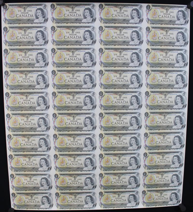 Uncut sheets comprising 1989 $1 Crow/Bouey P85c sheet of 40, and half-sheet of 20; plus 1986 $2 Thiessen/Crow P94b sheet of 24; Uncirculated.