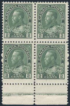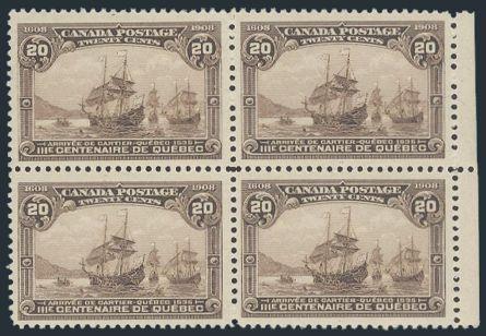 107, Bottom margin block with partial TYPE C LATHEWORK, F-VF, stamps are NH, natural gum skip, a few separated perfs, light crease in selvedge. Cat $1,000 (Image)