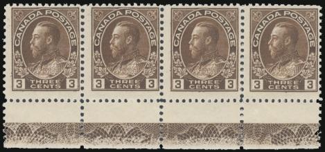 108, Bottom margin strip of 4 with LATHEWORK TYPE D. F, stamps are NH (one minute spot of DG on third stamp) (Image)