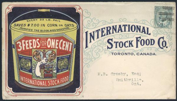 89, Toronto Precancel on a gorgeous multi-coloured illustrated advertising cover for INTERNATIONAL STOCK FOOD Co. of Toronto. Has advertising & illustrations on both sides. Addr to Smithville, Ont (rec b/s 9 Feb, 1910). F. A SPECTACULAR ADVERTISING COVER! (Image)