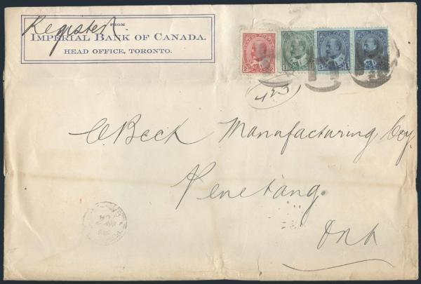 89-90, 91 (2), Tied on large size Reg'd envelope from the Imperial Bank of Canada in Toronto 2 May, 1908 to Penetang Ont. Has 2 nice red wax bank seals on reverse. The stamps pay a 13¢ rate. F, couple edge tears, some creasing (Image)