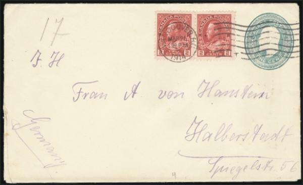 106 (Pair), Tied by Vancouver 25 Mar 1914 cancel on 1¢ KE postal stationery envelope paying 5¢ UPU rate to Hallberstadt, Germany. F (Image)