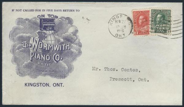 106, MR1, Tied by Kingston, Ont 27 Mar 1916 cancel on blue illustrated advertising cover for the Wormwith Piano, Co. Addr to Prescott, Ont. Has illustration of a piano atop the globe. F-VF (Image)