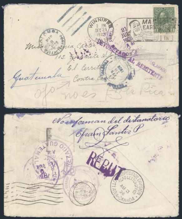 107, Tied by Winnipeg 21 Dec slogan cancel on cover addr to "El Cerrito, Contra Costa" (USA). MISSENT to Costa Rica then to Guatemala before being returned to Canada. Has multiple cancels & redirectional h/s's; plus Ottawa Dead Letter Office 3 Aug 1928 b/s. VG-F, some cover wear. A FASCINATING COVER (Image)