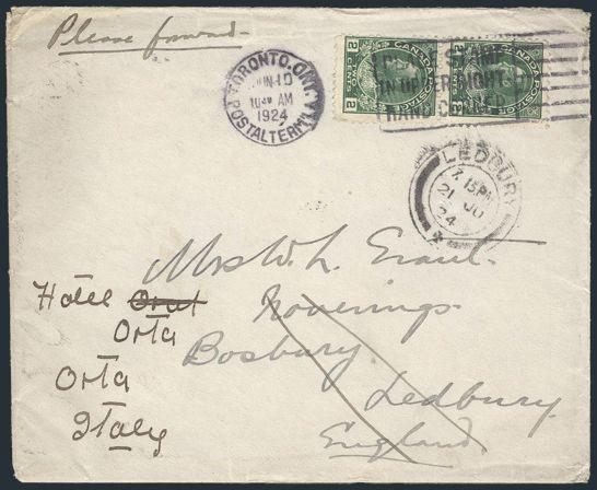 107 (Pair), Tied by Toronto 10 June 1924 slogan cancel on cover to LEDBURY ENGLAND (rec CDS). It was then redirected to ORTA ITALY (Italian rec b/s). F, minor soiling (Image)