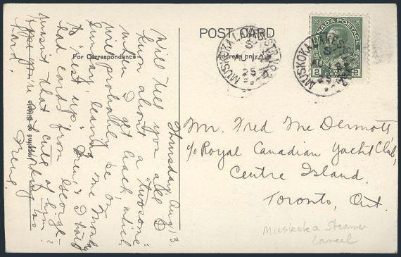 107, Tied by MUSKOKA LAKE STR No. 2 14 Aug 1925 cancel with another strike alongside on coloured postcard to Toronto. VF (Image)