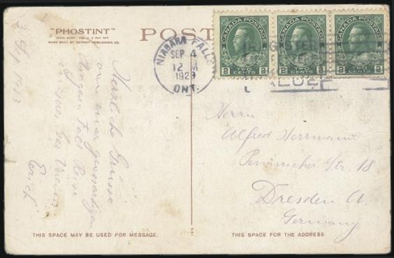 107 (Strip of 3) tied by Niagara Falls 4 Sept 1929 slogan cancel on colour photo postcard paying 6¢ UPU postcard rate to DRESDEN GERMANY. Card depicts Niagara Falls. F, small flaws. Scarce (Image)