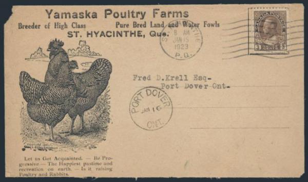 108, Tied by St. Hyacinthe PQ 15 Jan, 1923 machine cancel on pretty illustrated advertising postcard for Yamaska Poultry Farms. Depicts a Rooster and Hen. Addr to Port Dover Ont (rec b/s). F, one rounded corner (Image)