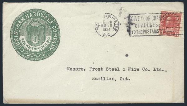 109, Tied by New Westminster BC 20 May, 1924 slogan cancel on illustrated advertising cover for the Cunningham Hardware Co. of New Westminster depicting a Lock. Addr to Hamilton, Ont. F (Image)