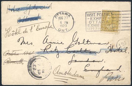 110, Tied by Ottawa Ont 27 Aug 1923 slogan cancel paying 4¢ rate on cover to LONDON ENGLAND (rec cancel 7 Sp). The cover was then forwarded to BRUSSELS BELGIUM & then AMSTERDAM HOLLAND with b/s's from each country. F (Image)