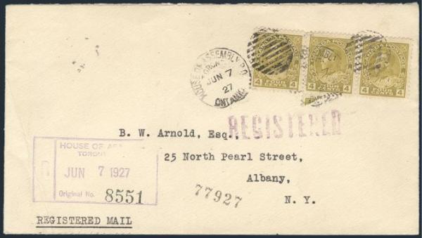 110, Horiz strip of 3 tied by House of Assembly PO Ontario 7 June 1927 duplex cancels on Reg'd cover to Albany, NY. Has Gov't imprint on back flap & nice b/s's. F, corner crease (Image)