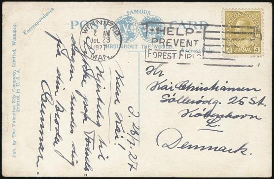 110, Tied by Winnipeg 29 July 1927 slogan cancel on 4¢ UPU rated colour postcard to DENMARK. Depicts T. Eaton & Co. Store in Winnipeg. F+ (Image)