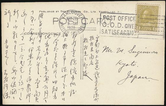 110, Tied by Vancouver 28 May 1928 slogan cancel on real b/w photo postcard depicting "Temple of Babel" mountain peak. Addr to KYOTO, JAPAN. Written in Japanese. F (Image)