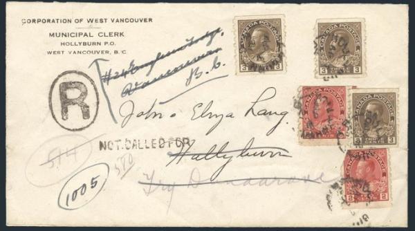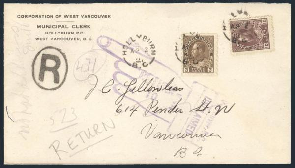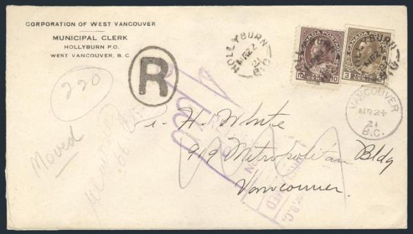 116, 129, Tied by Hollyburn, BC 22 Mar 1921 split-ring cancels on Reg'd cover with Corp of West Vancouver corner card to Vancouver & violet "Unclaimed / Return To" hand illustrated h/s. F-VF (Image)