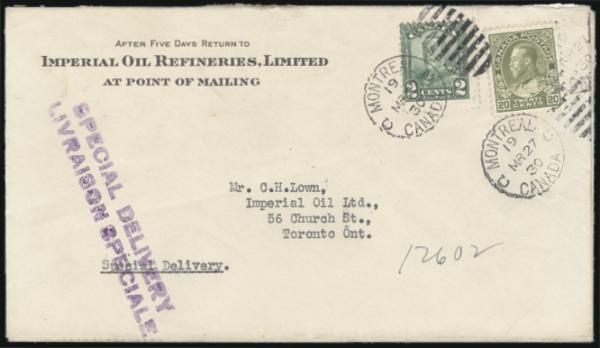 119 (2), 150 (2), Tied by 2 diff Montreal Mar 1930 cancels on 2 diff Special Delivery covers to Toronto. Have violet "SPECIAL DELIVERY" h/s's (one is bilingual) & Imperial Oil Refineries Ltd. corner cards. F-VF (2 covers) (Image)