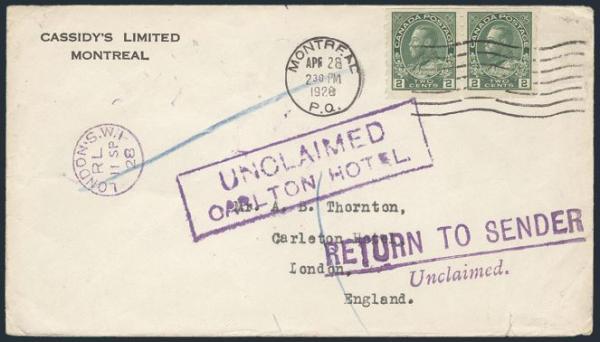 128, Coil pair, Tied by Montreal 28 Ap 1928 cancel on cover to LONDON ENGLAND. The cover was Unclaimed & Returned. Has various h/s's on front & reverse incl UNCLAIMED CARLTON HOTEL, RETURN TO SENDER, etc. F, small edge tear (Image)
