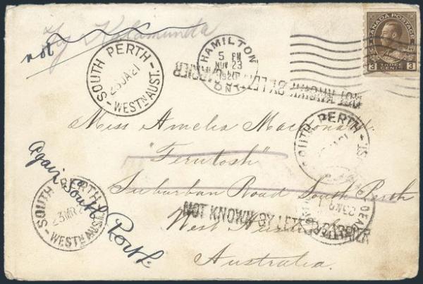 134, Tied by Hamilton Ont 23 Nov, 1920 machine cancel on cover to SOUTH PERTH, AUSTRALIA. Has two s/l handstamps "NOT KNOWN BY LETTER CARRIER" with multiple South Perth CDS's. The cover was returned to Canada and has Ottawa DEAD LETTER OFFICE 25 July, 1921 cancel. F (Image)