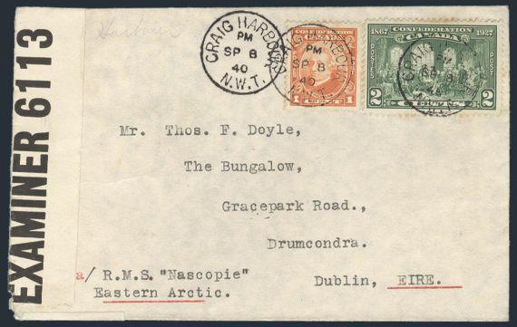 141-2, Tied by CRAIG HARBOUR, NWT 8 Sept 1940 CDS's on WWII cover to Dublin, Ireland. Has censor tape at left. Nice blue oval EASTERN ARCTIC / MAIL / SERVICE/ R.M.S. Nascopie b/s (last day of postal service at Craig Harbour). F-VF (Image)