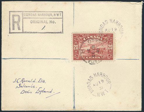 157, Scarce single franking of the 20¢ Harvesting tied by DUNDAS HARBOUR / NWT 19 Aug 1931 split-ring cancel on Reg'd cover to England (rec b/s). Has Montreal & Ottawa transits. F-VF (Image)