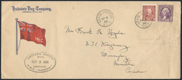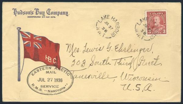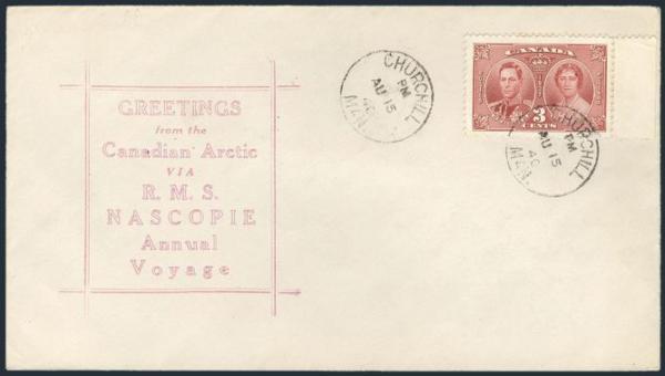233, Tied by Craig Harbour, NWT 26 Aug 1938 CDS on colour illustrated Hudson's Bay Co R.M.S. NASCOPIE EASTERN ARCTIC CRUISE cover. Addr to Goderich, Ont. Depicts Hudson's Bay Co., Red Ensign. F-VF