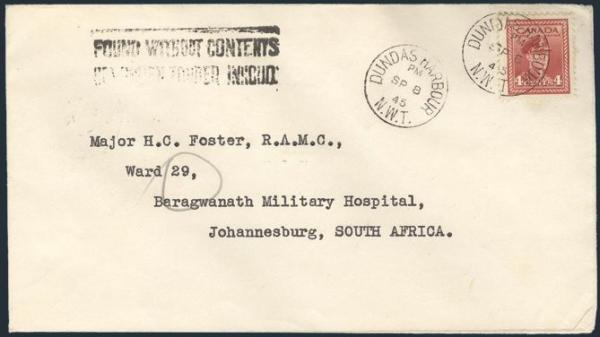 211/264 Pair, Tied by NWT cancels from Chesterfield Inlet, Dundas Harbour, Lake Harbour, Pangnirtung & Pond Inlet 1942-6 cancels. Addr to Canada, plus one to South Africa. Each has "EASTERN ARCTIC PATROL / CANADA" ship cancel on reverse. Nice Arctic related lot. F (5) (Image)
