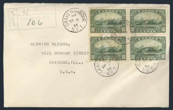 215 (Block), Tied by Craig Harbour, NWT 8 Sept 1935 CDS's on Reg'd ship cover to USA. Carried aboard R.M.S. Nascopie. Has Campbellton & Halifax RPO, Halifax & 2 diff Chicago transits. F-VF, touch of soiling. Nice Silver Jubilee cover (Image)