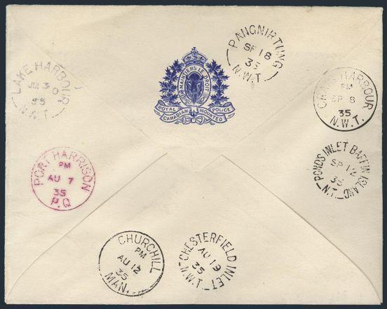 216, Tied by grid cancel on cover with blue embossed RCMP Crest on flap. Has 5 diff NWT 1935 cancels from Lake Harbour, Pangnirtung, Craig Harbour, Ponds Inlet, Chesterfield Inlet; plus Port Harrison & Port Burwell PQ & Churchill, Man CDS front & back. Carried aboard R.M.S. NASCOPIE. F (Image)