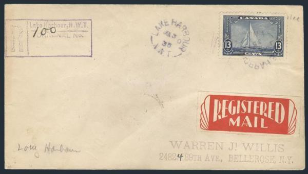 216, Scarce 13¢ Yacht single franking tied by Lake Harbour NWT 30 July, 1935 split-ring cancel with matching violet Reg'd h/s. Addr to USA. Has attractive red etiquette label. On reverse has 9 b/s's. F (Image)