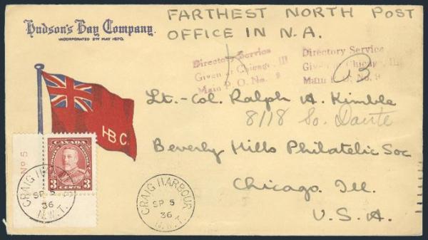 219 (Plate Number single), With CRAIG HARBOUR / NWT 5 Sept 1936 CDS (farthest north PO in North America) on Hudson's Bay Co. colour illustrated Red Ensign advertising cover to Chicago (carried aboard R.M.S. Nascopie). Sent by D. Leechman anthropologist, Nat. Museum, Ottawa. Also has Hudson Bay Co., illustrated stationery enclosure signed by Leechman. F-VF (Image)