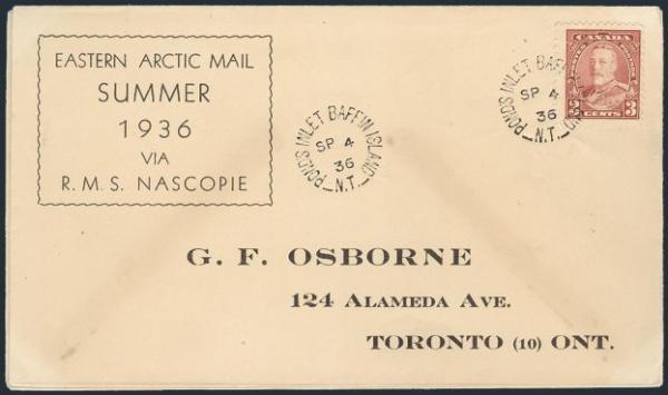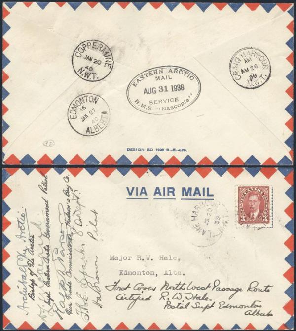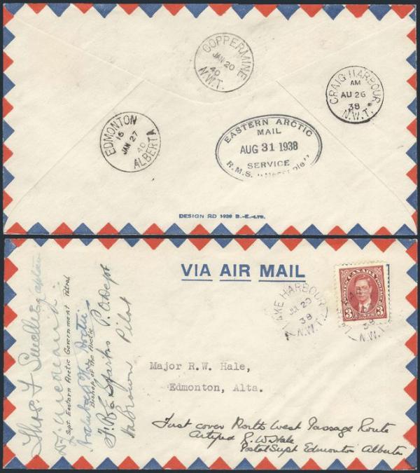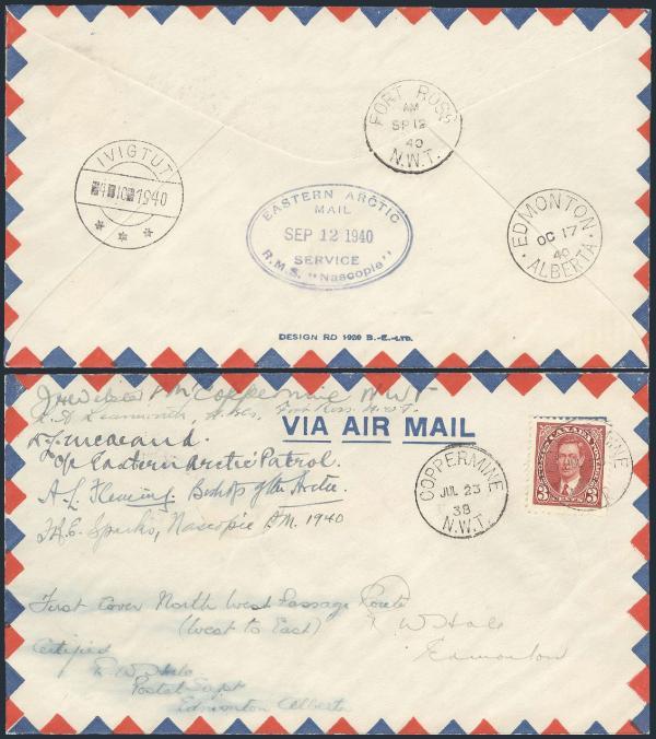 233, Tied by Coppermine, NWT 25 July 1938 CDS on "FIRST COVER NORTH WEST PASSAGE ROUTE (WEST to EAST) CERTIFIED R.W. HALE POSTAL SUPT" addr to Major Hale, Edmonton, Alta. Has Fort Ross, NWT; Ivigtut Greenland CDS; & blue oval "EASTERN ARCTIC / MAIL / SERVICE / R.M.S. Nascopie" 12 Sept 1940 b/s's. SIGNED by 2 diff POSTMASTERS, D. Mc KEAND, Superintendent for Eastern Arctic Patrol; A. FLEMING, Bishop of the Arctic & F. SPARKS, Nascopie Postmaster. F, a bit moisture affected. Very desirable item for an Arctic exhibit (Image)