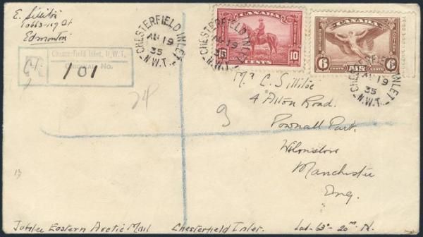 223, C5, Tied by Chesterfield Inlet / NWT 19 Aug 1935 split-ring cancels on cover with matching Reg'd h/s carried aboard R.M.S. Nascopie. Addr to England. Has Chesterfield Inlet cancels & Montreal Br. Mail & Halifax transit b/s's; plus enclosure. F-VF (Image)