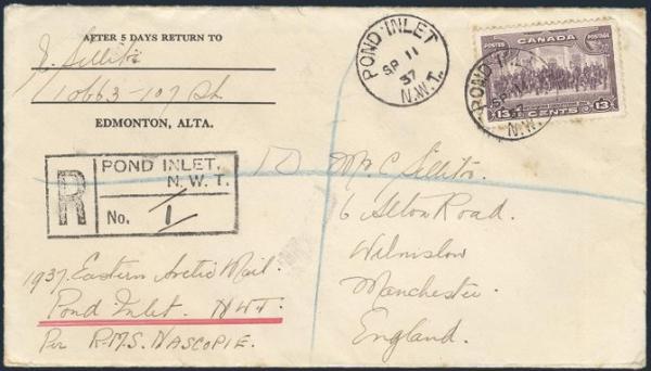 224, Tied by POND INLET / N.W.T. 11 Sept 1937 CDS on Nascopie ship cover with matching Reg'd h/s, addr to England. Has 2 similar Pond Inlet CDS's, oval "EASTERN ARCTIC / MAIL / SERVICE / R.M.S. Nascopie" strike & Halifax b/s's. F, touch of TS. Attractive (Image)