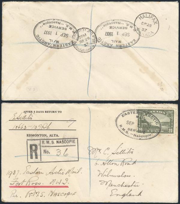 225, Tied by "EASTERN ARCTIC / MAIL / SERVICE / R.M.S. Nascopie" 1 Sept 1937 oval ship cancel on ship cover with matching Reg'd h/s. Addr to England. Has b/s's incl 2 additional Nascopie oval cancels, Montreal / British Mail Branch & Halifax transits. F (Image)