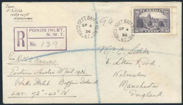 226, Scarce 50¢ Victoria franking tied by PONDS INLET BAFFIN ISLAND / N. T. 4 Sept 1936 split-ring cancel on Nascopie cover with matching violet Reg'd h/s to England. Has 2 similar Ponds Inlet strikes plus Halifax transit b/s's. F, minor TS around stamp (Image)